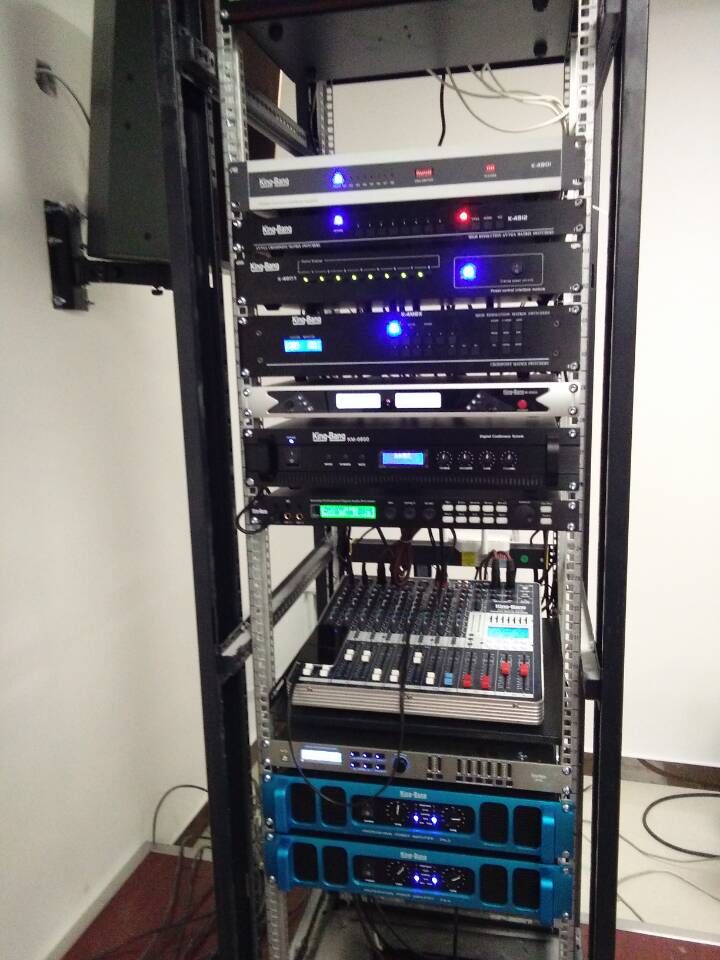 該項目中主擴(kuò)揚(yáng)聲器采用了兩只可調(diào)指向音箱壁掛的安裝方式,因此為了保證聲場均勻度達(dá)到廳堂擴(kuò)聲系統(tǒng)聲學(xué)特性指標(biāo)中的國家規(guī)定,京邦電子技術(shù)人員在調(diào)試過程中對兩只音箱進(jìn)行了仔細(xì)的調(diào)整,將音箱指向調(diào)整到可以最佳,使得聲音可以均勻的覆蓋,另外對六只后場吸頂音箱加以延時、音量等處理,避免了聲像不統(tǒng)一的問題。